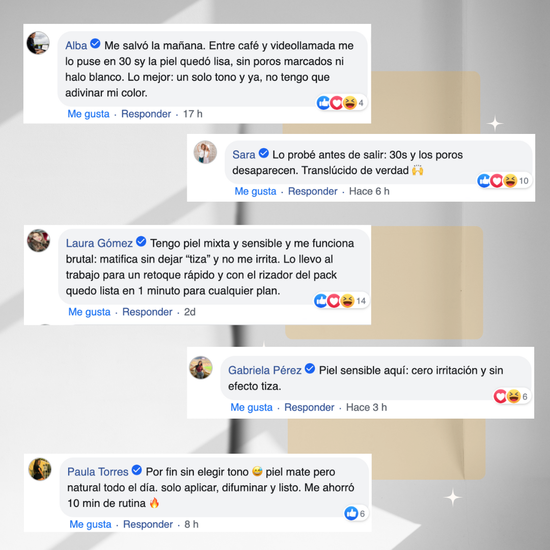 Si tu día no te regala tiempo, este sí: aplica, difumina y sal. Nuestro Eliminador de Poros Translúcido Universal suaviza la textura al instante, controla el brillo y fija un acabado natural que dura sin elegir tono ni rutinas eternas, ni promesas vacías solo resultados rápidos y fiables, hechos para gente que exige verse bien ya.