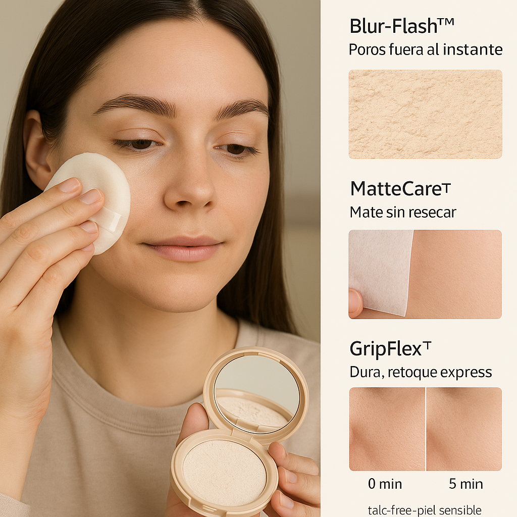 Cuando el día va a mil, no necesitas otra “rutina”, necesitas un atajo fiable: aplica, difumina y listo. Nuestro eliminador de poros en polvo suaviza la textura al instante, controla el brillo sin resecar y fija un acabado natural que aguanta tu jornada.